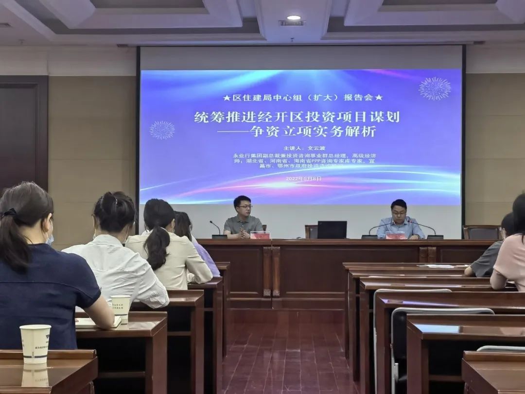 2022年5月8日,永业行咨询评估集团副总裁文云波应邀为武汉经开区(汉南区)住房和城乡建设局作“统筹推进经开区投资项目谋划——争资立项实务解析”专题交流培训。武汉经开区(汉南区)住房和城乡建设局党组书记、局长樊友川主持会议。
